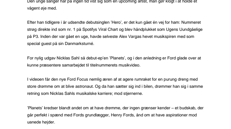 I videoen får den nye Ford Focus nemlig æren af at agere rumraket for en purung dreng med store drømme om at blive astronaut. Og da han sætter sig ind i bilen, drømmer han sig i samme retning som Nicklas Sahls musikalske karriere; mod stjernerne.