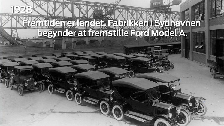 I år er det et helt århundrede siden, at Ford kom til Danmark. Faktisk åbnede Ford i 1919 sin første samlefabrik på det europæiske fastland i Heimsdalsgade på Nørrebro, hvor man producerede Ford T-biler på landets første samlebånd. I 1924 udvidede man til en langt større samlefabrik i Sydhavnen, der både producerede Ford T, Ford A og senere Ford-modeller.