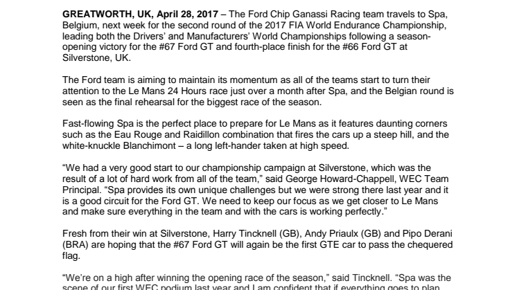 I denne uge starter anden runde af 2017 World Endurance Championship. Ford Chip Ganassi Racing holdet er rejst til Spa i Belgien for at deltage i lørdagens løb, i håb om at kunne gentage sæsonstartens sejr på Silverstone.