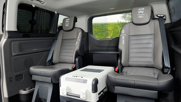 Nu har Ford løst problemet med en speciel udgave af minibussen Ford Tourneo Custom. Med komforten og bekvemmeligheden fra Team Skys luksusbus, er den enkeltstående udgave af Ford Tourneo Custom udstyret med både tekøkken, køleskab og komfortable flysæder, stikkontakter og køletæpper, der lader rytterne køle ned efter en lang etape.