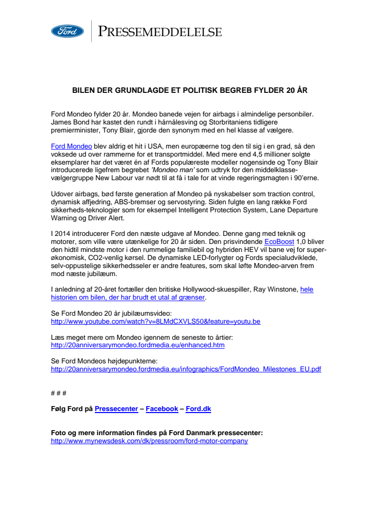 Ford Mondeo fylder 20 år. Mondeo banede vejen for airbags i almindelige personbiler. James Bond har kastet den rundt i hårnålesving og Storbritaniens tidligere premierminister, Tony Blair, gjorde den synonym med en hel klasse af vælgere.