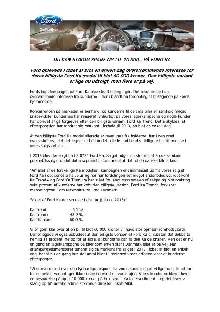 Ford oplevede i løbet af blot en enkelt dag overstrømmende interesse for deres billigste Ford Ka model til blot 60.000 kroner. Den billigste variant er lige nu udsolgt, men flere er på vej.
