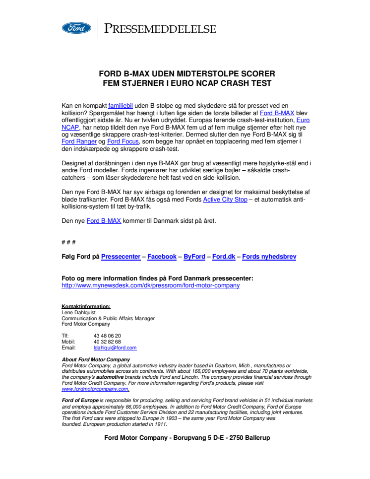 Kan en kompakt familiebil uden B-stolpe og med skydedøre stå for presset ved en kollision? Spørgsmålet har hængt i luften lige siden de første billeder af Ford B-MAX blev offentliggjort sidste år. Nu er tvivlen udryddet. Europas førende crash-test-institution, Euro NCAP, har netop tildelt den nye Ford B-MAX topkarakter med fem ud af fem mulige stjerner.