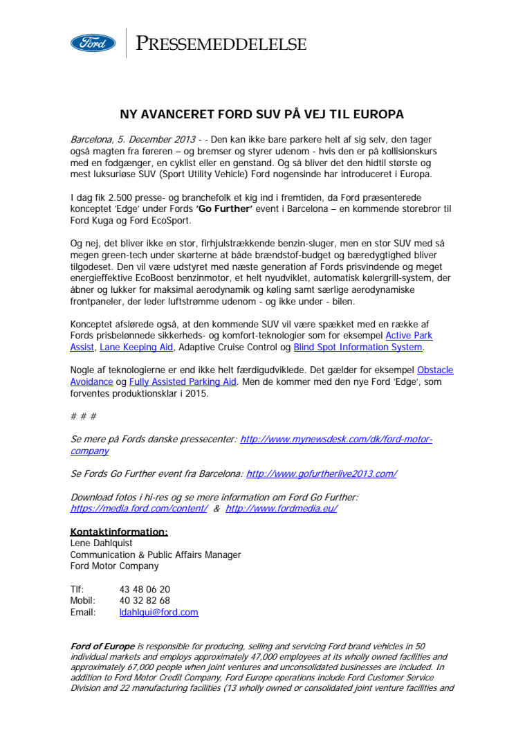 Den kan ikke bare parkere helt af sig selv, den tager også magten fra føreren – og bremser og styrer udenom - hvis den er på kollisionskurs med en fodgænger, en cyklist eller en genstand. Ford Edge bliver den hidtil største og mest luksuriøse SUV (Sport Utility Vehicle) Ford nogensinde har introduceret i Europa.