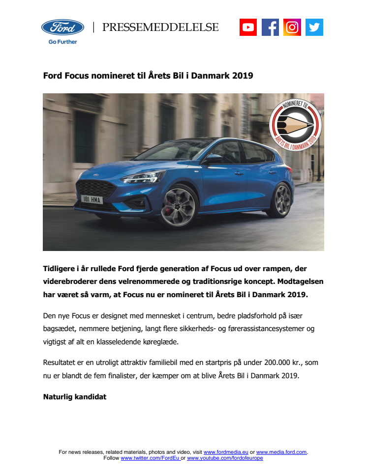 Tidligere i år rullede Ford fjerde generation af Focus ud over rampen, der viderebroderer dens velrenommerede og traditionsrige koncept. Modtagelsen har været så varm, at Focus nu er nomineret til Årets Bil i Danmark 2019.