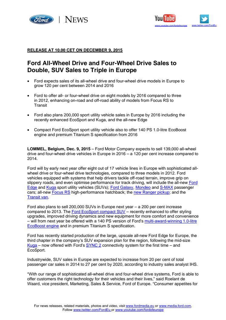 • Ford expects sales of its all-wheel drive and four-wheel drive models in Europe to grow 120 per cent between 2014 and 2016