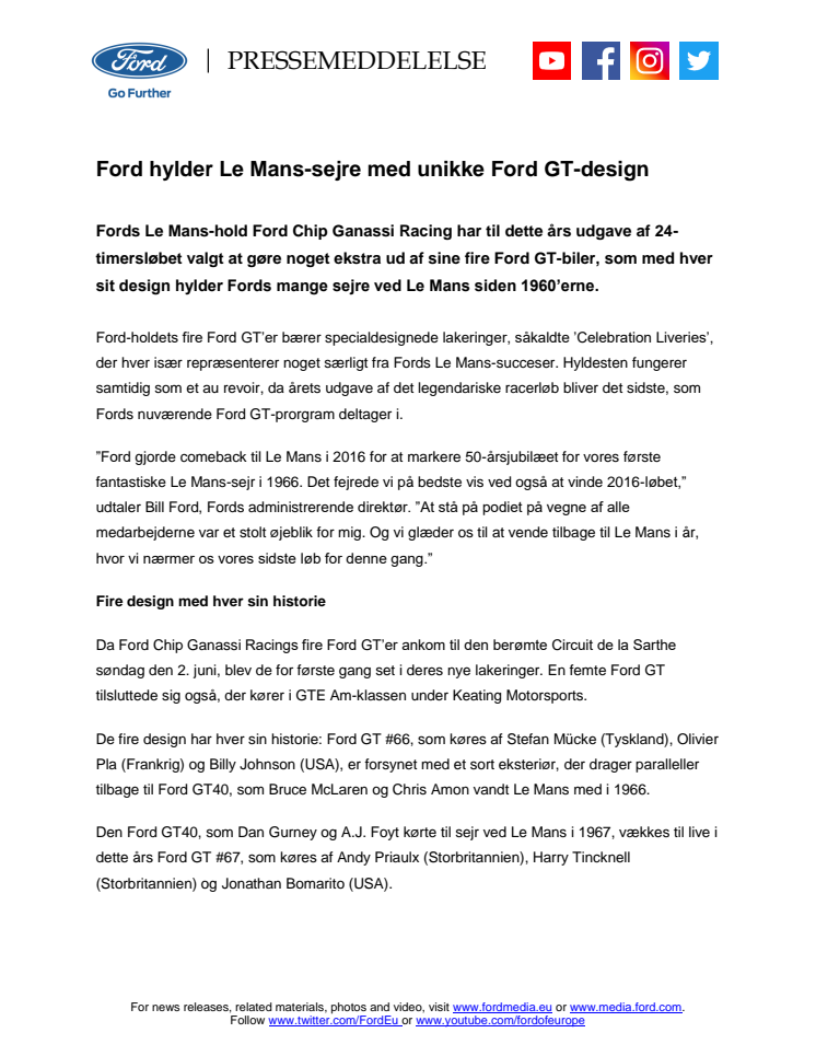 Fords Le Mans-hold Ford Chip Ganassi Racing har til dette års udgave af 24-timersløbet valgt at gøre noget ekstra ud af sine fire Ford GT-biler, som med hver sit design hylder Fords mange sejre ved Le Mans siden 1960’erne.