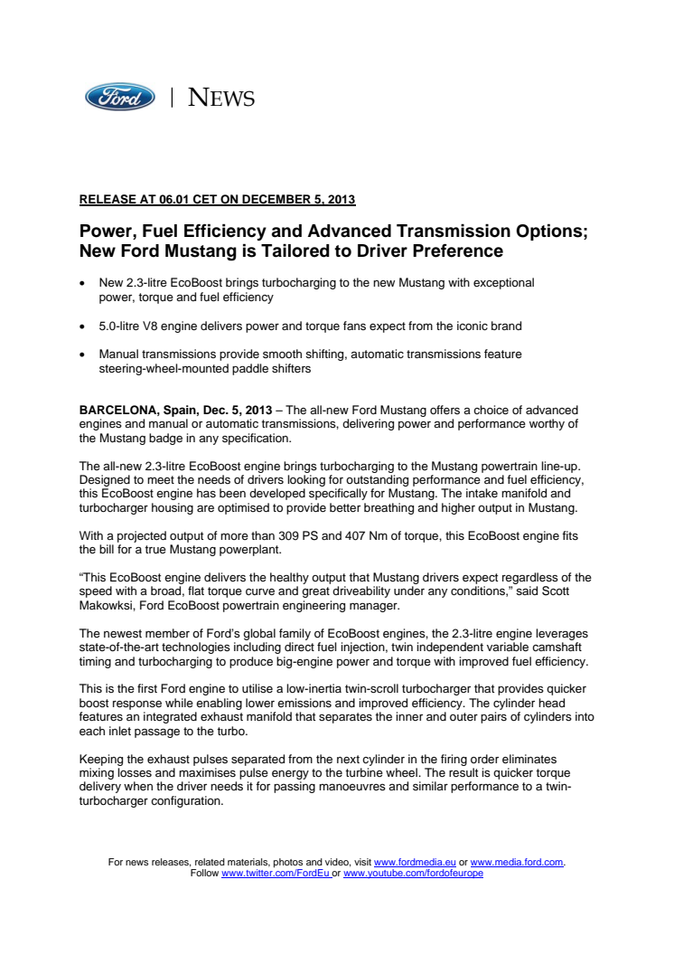 FORD MUSTANG POWERTRAIN - INTERNATIONAL PRESS RELEASE