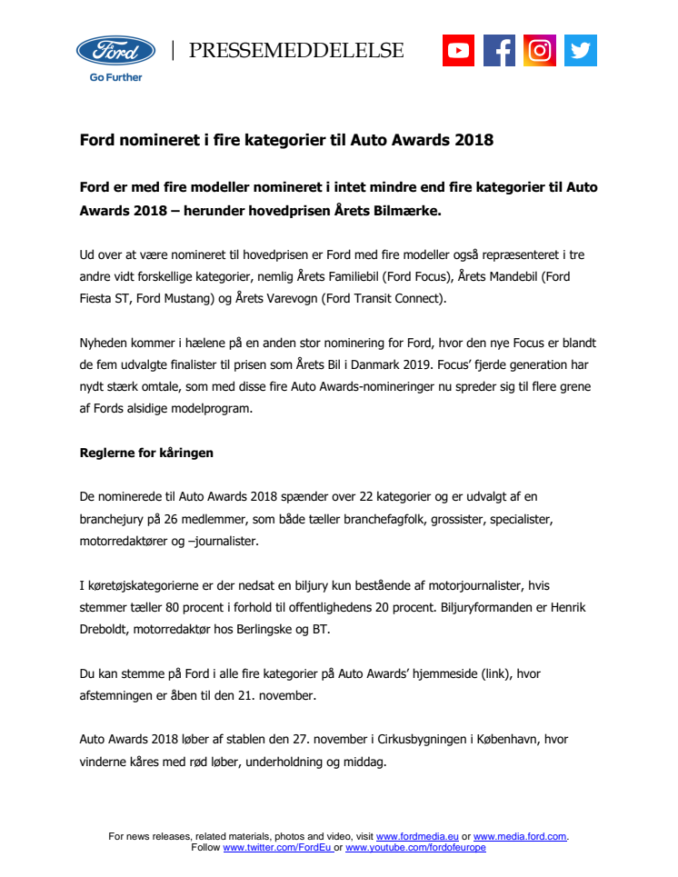 Ford er med fire modeller nomineret i intet mindre end fire kategorier til Auto Awards 2018 – herunder hovedprisen Årets Bilmærke.
