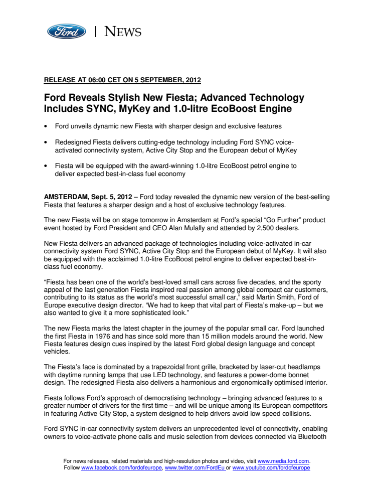 Ford Reveals Stylish New Fiesta; Advanced Technology Includes SYNC, MyKey and 1.0-litre EcoBoost Engine