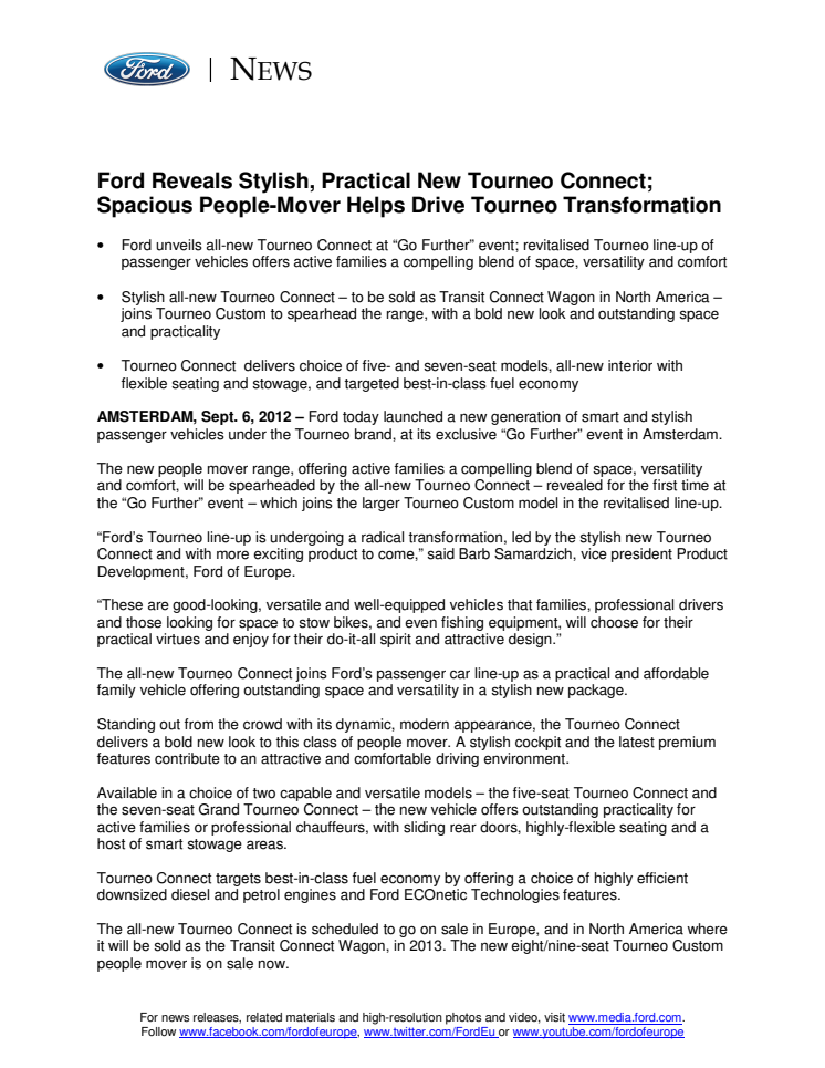Ford today launched a new generation of smart and stylish passenger vehicles under the Tourneo brand, at its exclusive “Go Further” event in Amsterdam. The new people mover range, offering active families a compelling blend of space, versatility and comfort, will be spearheaded by the all-new Tourneo Connect – revealed for the first time at the “Go Further” event
