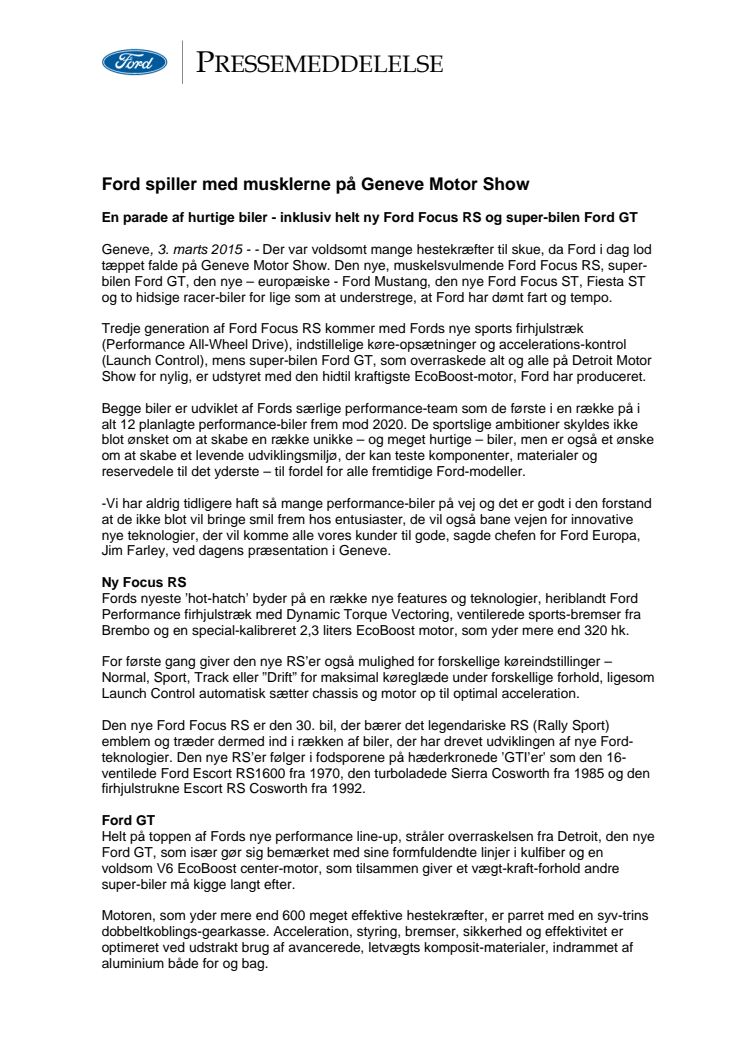 Der var voldsomt mange hestekræfter til skue, da Ford i dag lod tæppet falde på Geneve Motor Show. Den nye, muskelsvulmende Ford Focus RS, super-bilen Ford GT, den nye – europæiske – Ford Mustang, den nye Ford Focus ST, Fiesta ST og to hidsige racer-biler for lige som at understrege, at Ford har dømt fart og tempo.