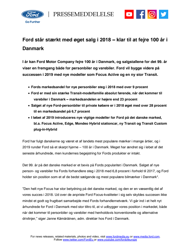 I år kan Ford Motor Company fejre 100 år i Danmark, og salgstallene for det 99. år viser en fremgang både for personbiler og varebiler. Ford vil bygge videre på successen i 2019 med nye modeller som Focus Active og en ny stor Transit.