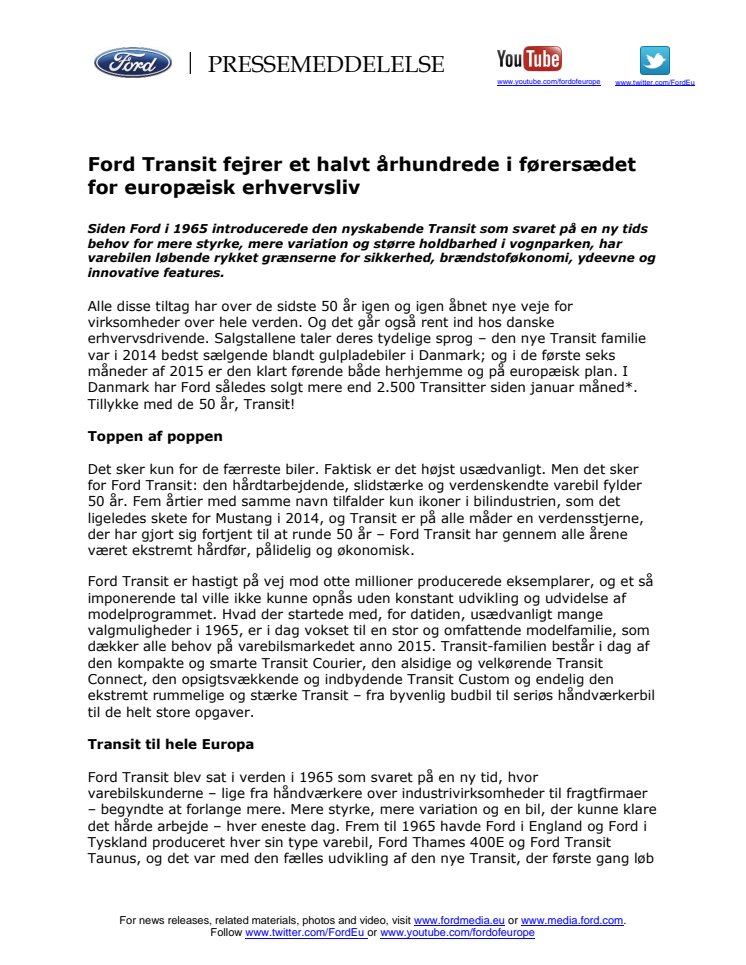 Ford Transit fejrer et halvt århundrede i førersædet for europæisk erhvervsliv