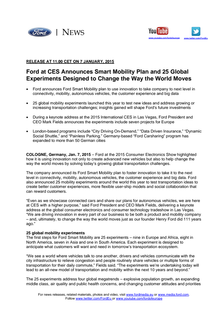 Delebiler, selvkørende biler og helt nye trafik-kommunikationssystemer skal befri verden for forurening og stadig større trafikpropper. Ford igangsætter 25 globale eksperimenter med afsæt i morgendagens trafikale udfordring