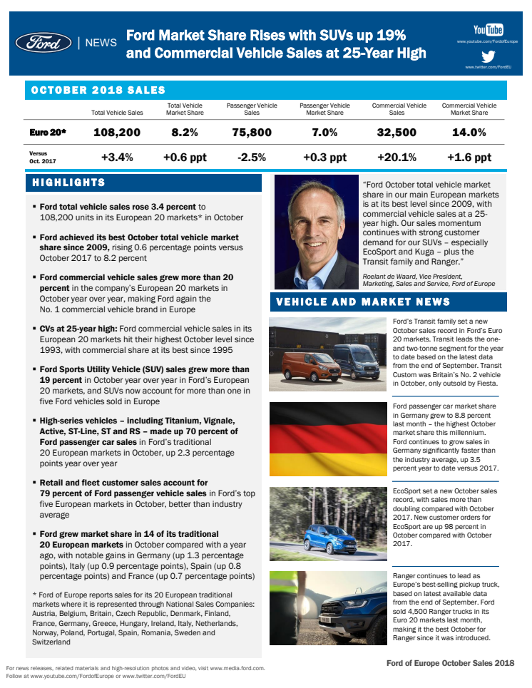 Fords europæiske markedsandel er vokset i oktober og er på sit højeste siden 2009. Resultatet kommer på baggrund af Fords højeste varebilssalg i 25 år og høj SUV-efterspørgsel på særligt modeller som EcoSport og Kuga.