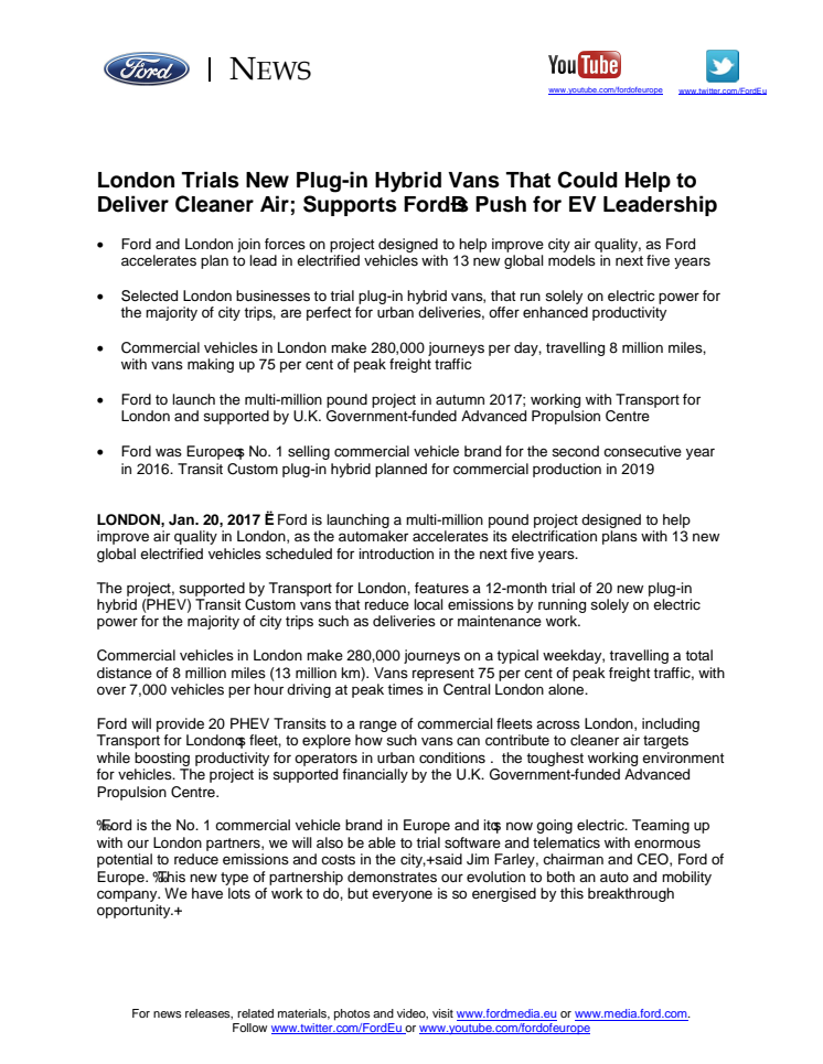 Ford og London by går sammen om at forbedre millionbyens luftkvalitet med plug-in hybrid Transit Custom varebiler. Ford fremrykker med projektet sine planer om at blive førende inden for el-biler med 13 nye globale modeller inden for de næste fem år.