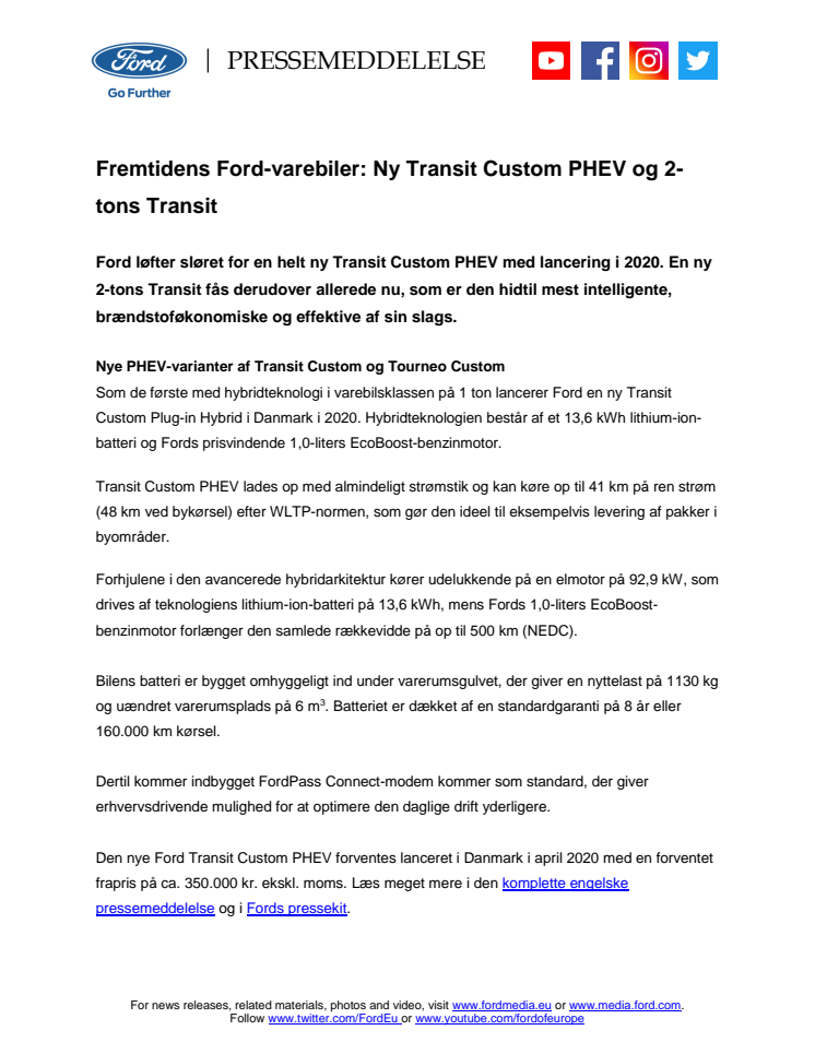 Ford løfter sløret for en helt ny Transit Custom PHEV med lancering i 2020. En ny 2-tons Transit fås derudover allerede nu, som er den hidtil mest intelligente, brændstoføkonomiske og effektive af sin slags.