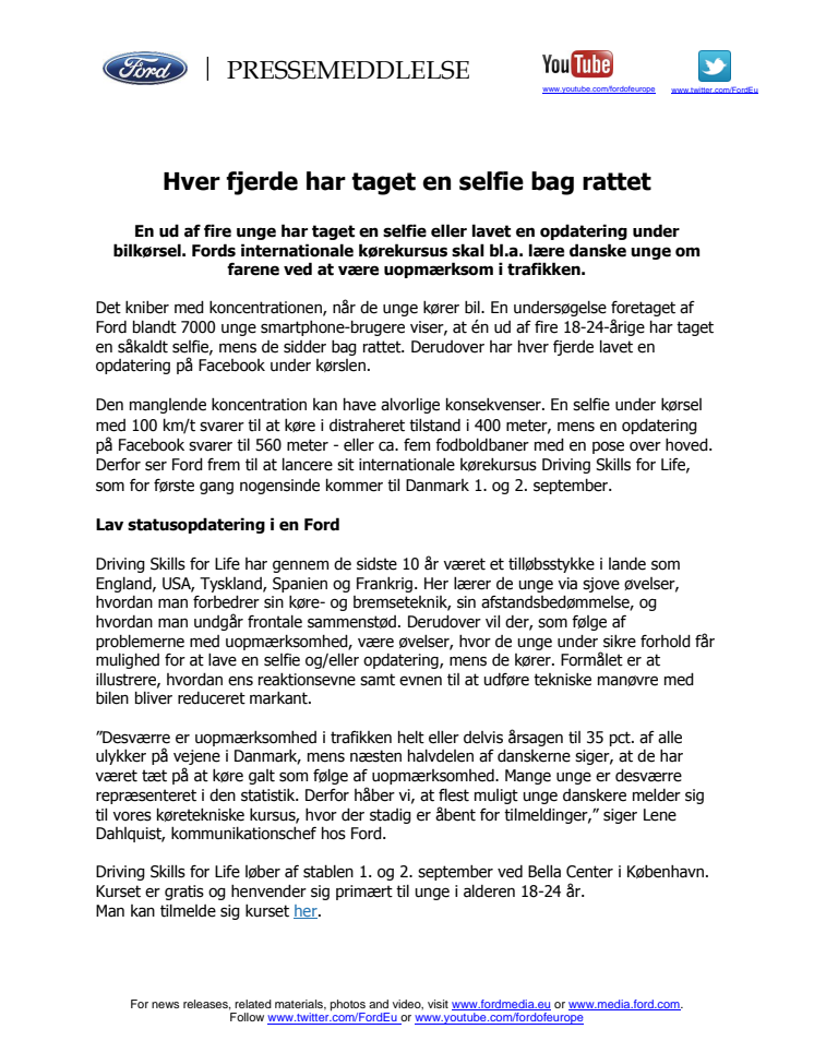 En ud af fire unge har taget en selfie eller lavet en opdatering under bilkørsel. Fords internationale kørekursus skal bl.a. lære danske unge om farene ved at være uopmærksom i trafikken.