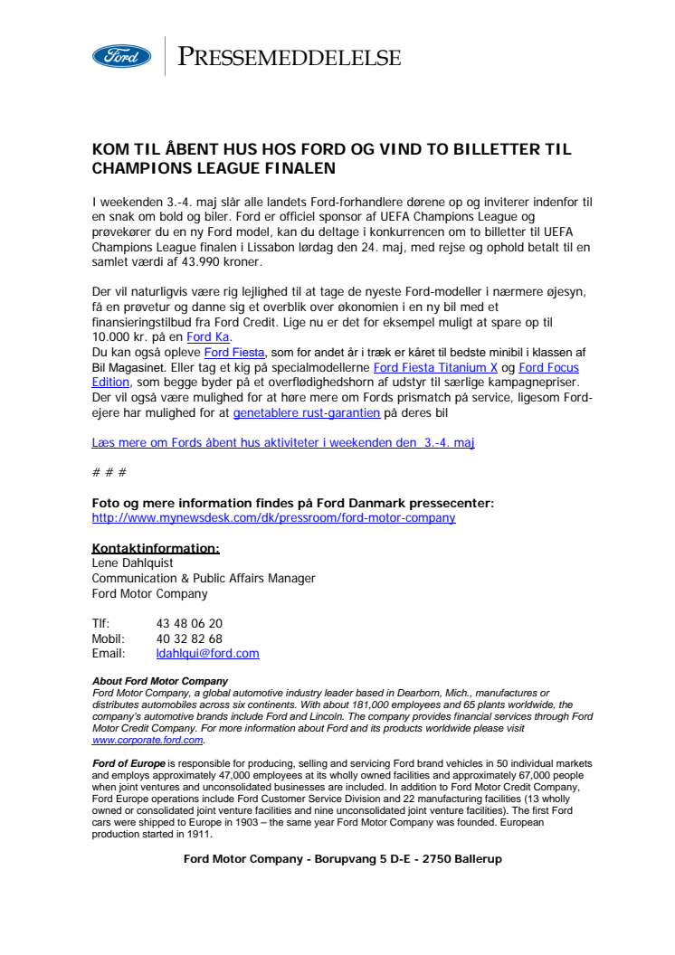 I weekenden 3.-4. maj slår alle landets Ford-forhandlere dørene op og inviterer indenfor til en snak om bold og biler. Ford er officiel sponsor af UEFA Champions League og når du prøvekører en ny Ford model, kan du deltage i konkurrencen om to billetter til UEFA Champions League finalen i Lissabon lørdag den 24. maj, med rejse og ophold betalt til en samlet værdi af 43.990 kroner.