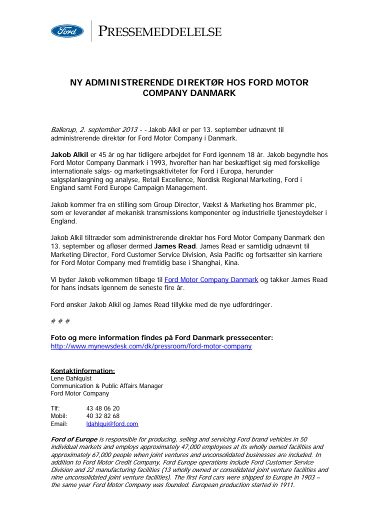Jakob Alkil er per 13. september udnævnt til ny administrerende direktør for Ford Motor Company i Danmark.
