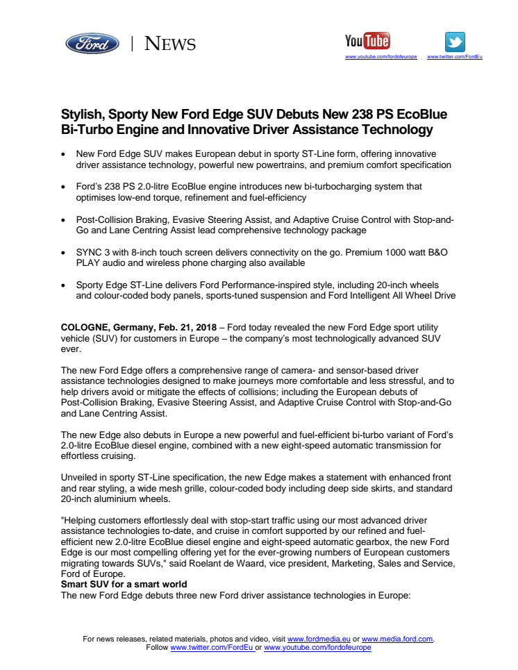 Den spritnye Ford Edge indtager det europæiske marked – det er Fords mest teknologisk avancerede SUV til dato. Ford Edge får også debut i den sporty ST-Line-udgave med bl.a. innovativ førerassistancer for større sikkerhed, kraftfuld og brændstoføkonomiske motorer samt ekstra komfort for en bedre køreoplevelse.
