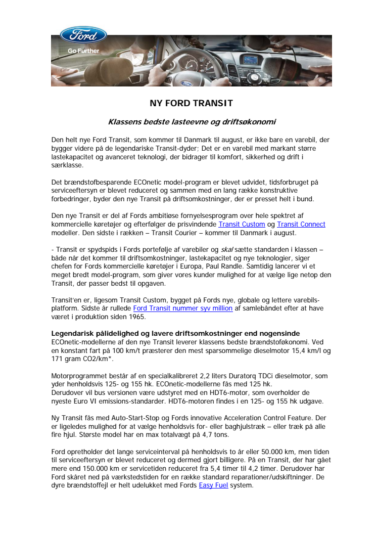 Den helt nye Ford Transit, som kommer til Danmark til august, er ikke bare en varebil, der bygger videre på de legendariske Transit-dyder; Det er en varebil med markant større lastekapacitet og avanceret teknologi, der bidrager til komfort, sikkerhed og drift i særklasse.