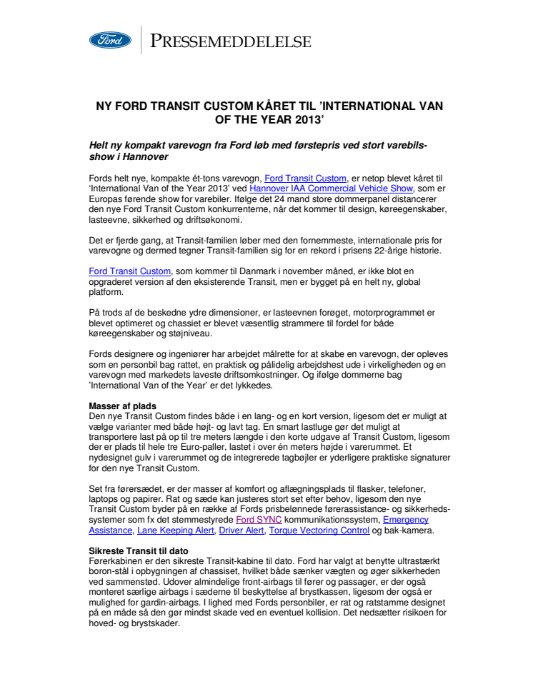 Fords helt nye, kompakte ét-tons varevogn, Ford Transit Custom, er netop blevet kåret til ‘International Van of the Year 2013’ ved Hannover IAA Commercial Vehicle Show, som er Europas førende show for varebiler. Ifølge det 24 mand store dommerpanel distancerer den nye Ford Transit Custom konkurrenterne, når det kommer til design, køreegenskaber, lasteevne, sikkerhed og driftsøkonomi.