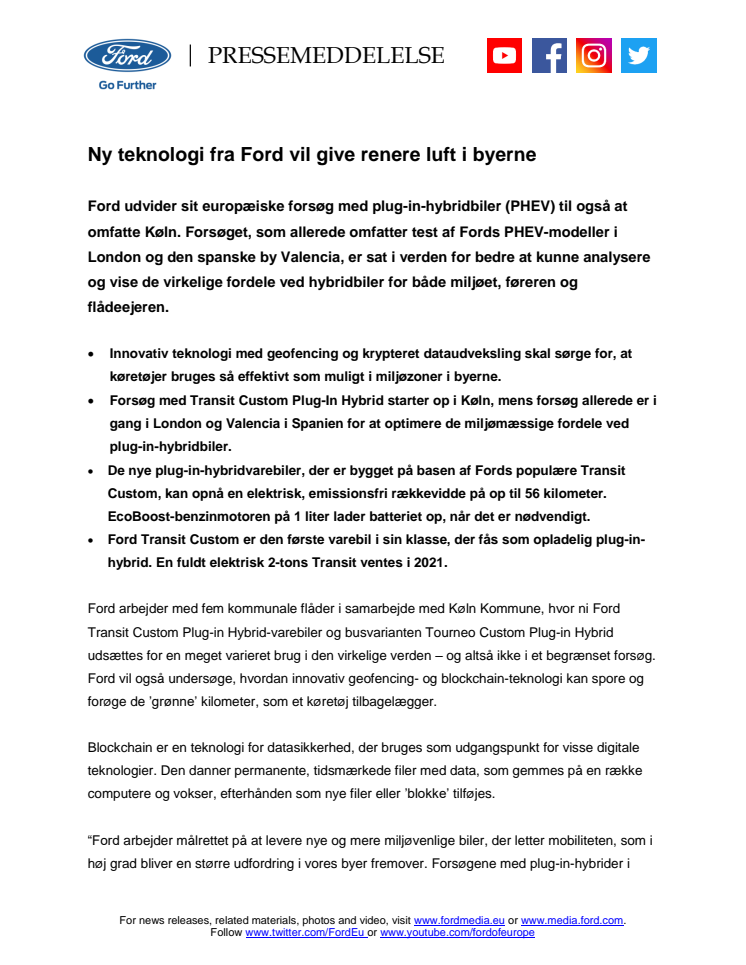 Ford udvider sit europæiske forsøg med plug-in-hybridbiler (PHEV) til også at omfatte Køln. Forsøget, som allerede omfatter test af Fords PHEV-modeller i London og den spanske by Valencia, er sat i verden for bedre at kunne analysere og vise de virkelige fordele ved hybridbiler for både miljøet, føreren og flådeejeren.