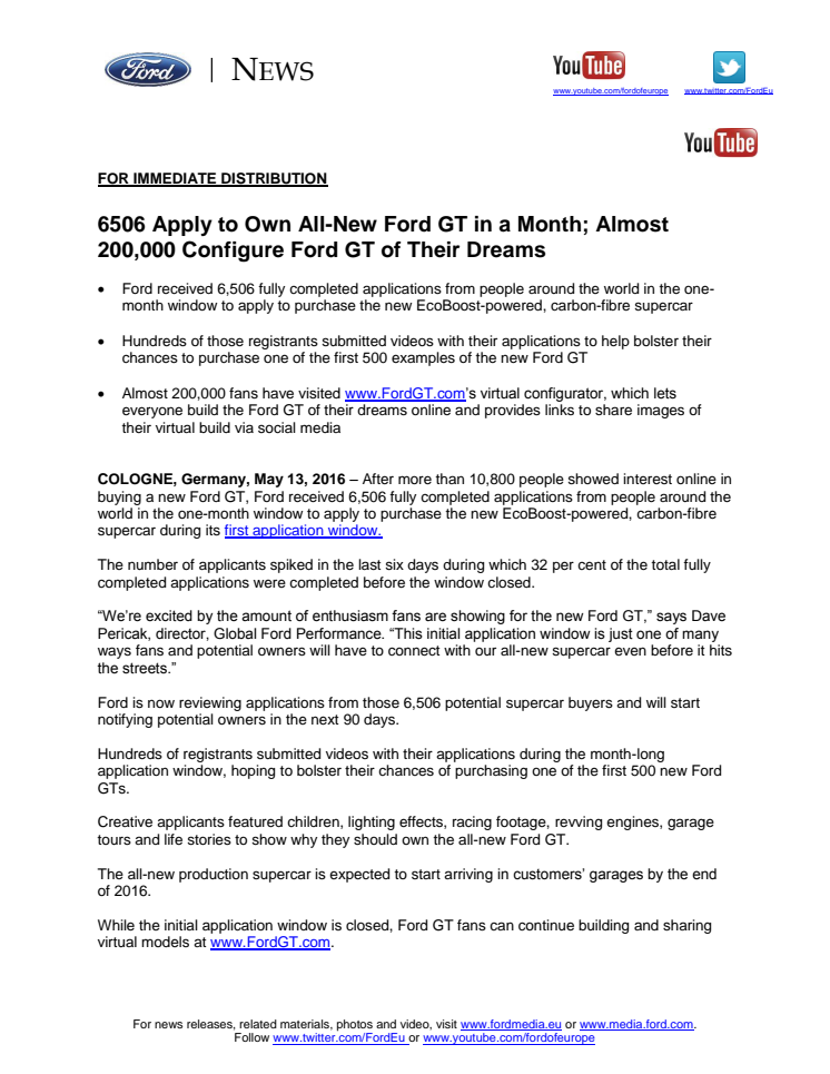 I løbet af den ene måned, hvor man kunne ansøge om at købe en Ford GT, modtog Ford 6.506 seriøse henvendelser. Samtidig har næsten 200.000 konfigureret deres drømmeudgave af den legendariske bil online.