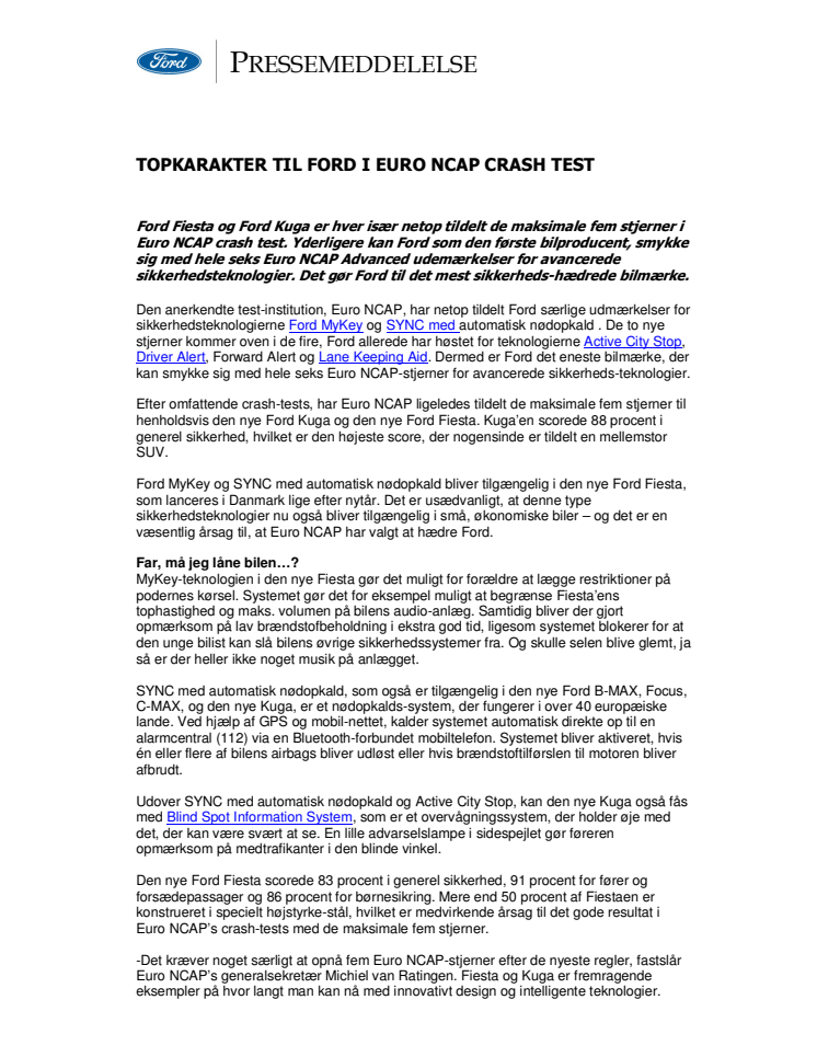 Ford Fiesta og Ford Kuga er hver især netop tildelt de maksimale fem stjerner i Euro NCAP crash test. Yderligere kan Ford som den første bilproducent, smykke sig med hele seks Euro NCAP Advanced udemærkelser for avancerede sikkerhedsteknologier. Det gør Ford til det mest sikkerheds-hædrede bilmærke.