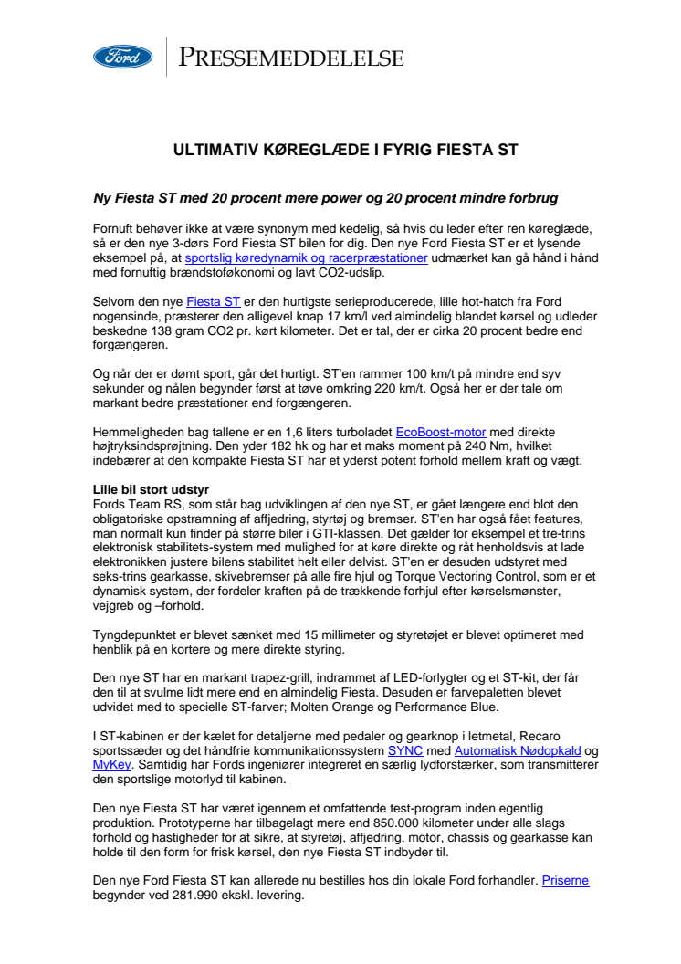 Fornuft behøver ikke at være synonym med kedelig, så hvis du leder efter ren køreglæde, så er den nye 3-dørs Ford Fiesta ST bilen for dig. Den nye Ford Fiesta ST er et lysende eksempel på, at sportslig køredynamik og racerpræstationer udmærket kan gå hånd i hånd med fornuftig brændstoføkonomi og lavt CO2-udslip.