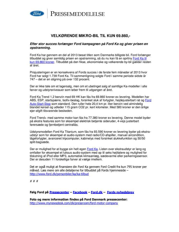 Ford Ka har gennem en del af 2013 besat titlen som Danmarks billigste bil. Efter stor succes forlænger Ford tilbuddet og giver samtidig prisen en opstramning, så du nu kan få en spritny Ford Ka til kun 69.860 kroner.