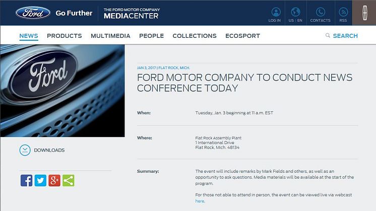 Ford Motor Company to Conduct News Conference Today (kl 17.00, Danmark)