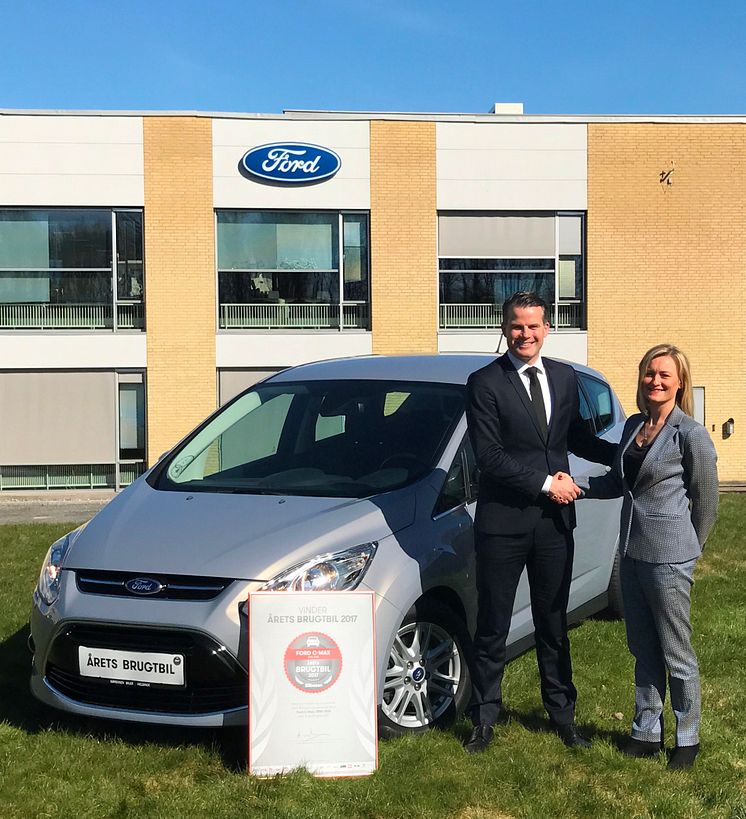 Salgsdirektør for Bilbasen og Bilinfo, Tom Due Andersen ønsker Lene Dahlquist, Kommunikationschef hos Ford Danmark tillykke med kåringen af Ford C-MAX som Årets Brugtbil 2017.