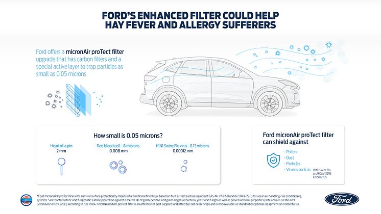 Ford-ejere kan nu udstyre deres bil med et optimeret luftfilter, der opfanger støv, pollen og andre allergifremkaldende partikler. Filteret ved navn Ford MicronAir ProTect er udviklet af filtreringsvirksomheden Freudenberg. Det anvender kul og et aktivt lag med blandt andet citronsyre til at beskytte mod uønskede bakterier, allergener og vira, der kan være sundhedsskadelige.