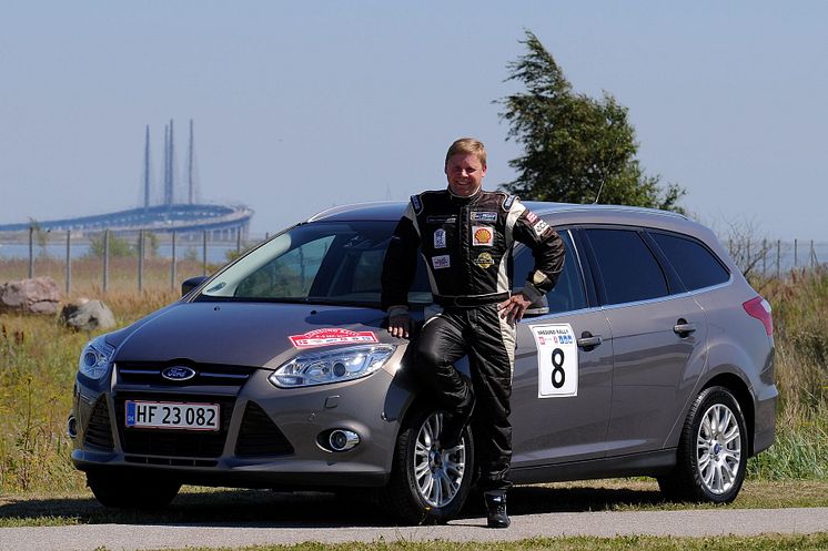 Racerkøreren Martin Berner skal køre økonomisk i Oresund Rally i Ford Focus med den nye 1.0 EcoBoostmotor. Under løbet skal han blandt andet passere Øresundsbroen, som ses i baggrunden.