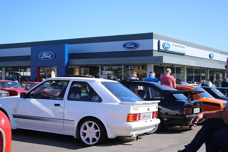 Fords 100 år i Danmark blev fejret med stort anlagt sensommertræf på Egeskov Slot. Ford Classic Club afholdt begivenheden, der startede ud hos Ford-forhandler N. Kjær Bilcentret i Svendborg.