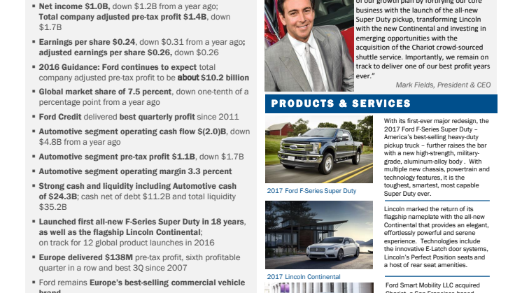 At 9 a.m. EDT, Mark Fields, Ford president and chief executive officer, and Bob Shanks, Ford executive vice president and chief financial officer, will host a conference call to discuss Ford’s 2016 third quarter results.