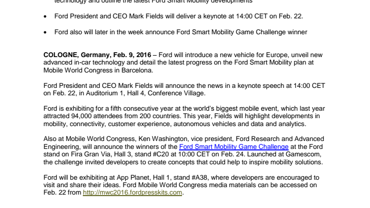 Ford er i år i høj grad til stede ved den store Mobile World Congress. I år vil Ford bl.a. præsentere et helt nyt køretøj til det europæiske marked. Desuden vil man præsentere nye teknologier og fortælle om udviklingen inden for Ford Smart Mobility. Alt dette vil Fords CEO, Mark Fields præsentere ved auditorium nr. 1 i hal 4 mandag d. 22. februar kl. 14.
