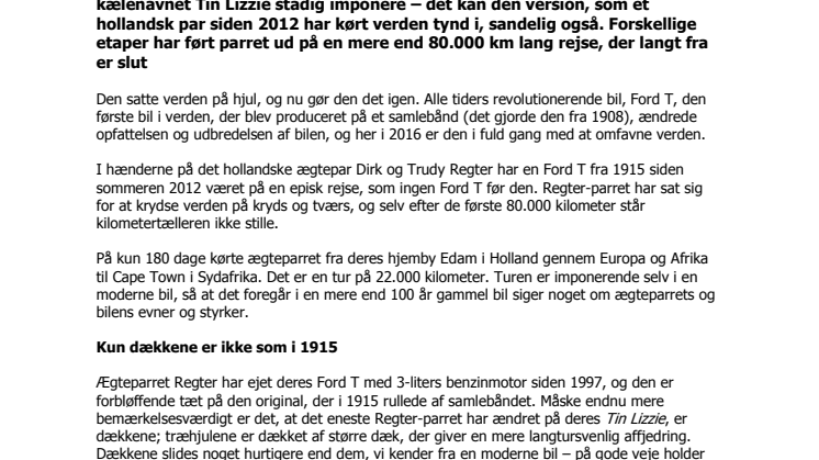 I hænderne på det hollandske ægtepar Dirk og Trudy Regter har en Ford T fra 1915 siden sommeren 2012 været på en episk rejse, som ingen Ford T før den. Regter-parret har sat sig for at krydse verden på kryds og tværs, og selv efter de første 80.000 kilometer står kilometertælleren ikke stille.