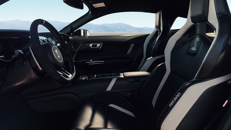 Shelby GT500’s purpose-built cockpit boasts race-inspired premium materials and unique finishes worthy of its world-class power. Premium touchpoints include an available exposed carbon fiber instrument panel appliqué and new door panel inserts in Dark Slate Miko® suede with accent stitching. Available Recaro racing seats with firm side bolstering and pass-throughs for safety harnesses offer the highest level of performance. For those looking for even greater comfort, power-adjustable seating with Miko suede inserts is offered.