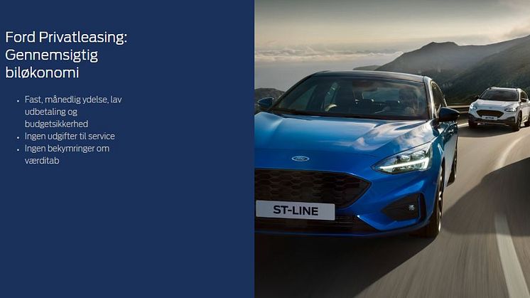 Ford har gjort det enkelt og fleksibelt at privatlease. Du kan til hver en tid bestille privatleasing online på fordprivatleasing.dk, hvor du altid har overblik over dine månedlige omkostninger og hvordan forskellige leasingvalg påvirker dem.