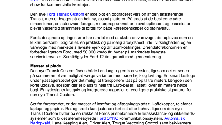 Ny Ford Transit Custom byder op til dans med unikke køreegenskaber, lastekapacitet, sikkerhed og driftsøkonomi, som gjorde den til International Van of the Year 2013
