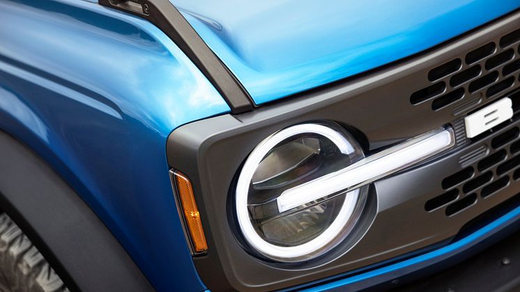 Den nye Bronco er blandt andet kendetegnet ved sit brede frontgitter, de ikoniske runde forlygter og bilens firkantede design, der er med til at sikre et klart udsyn fra bilen, hvilket er en klar fordel i udfordrende terræn. Unikke funktioner som fastgørelsespunkter på bilen, gør det muligt at montere udstyr på op til 68 kg som for eksempel en kano eller et surfbræt4.