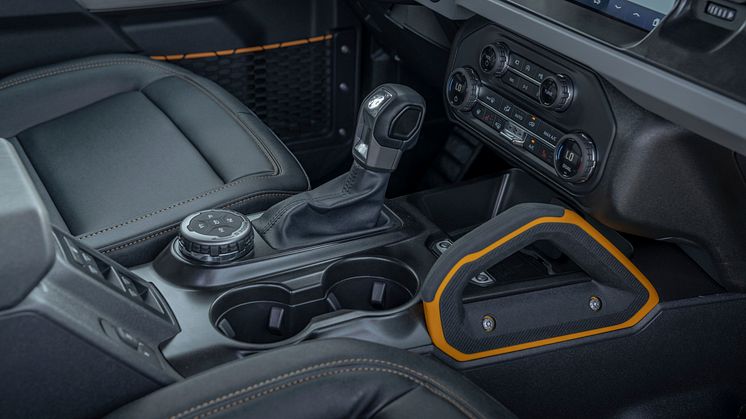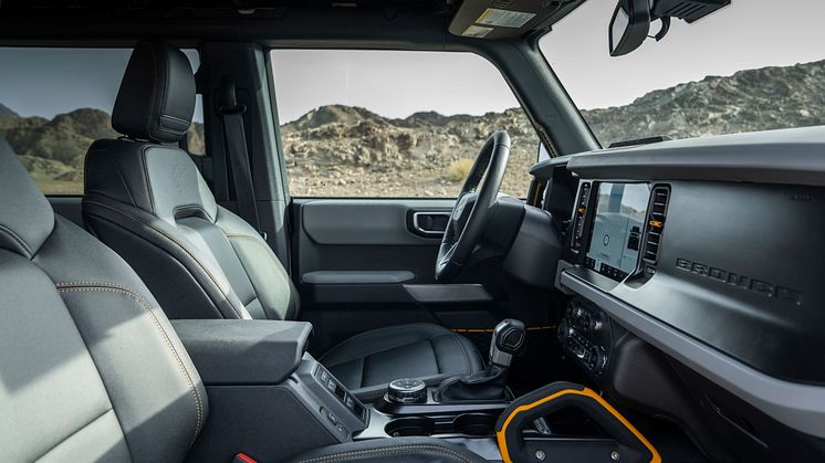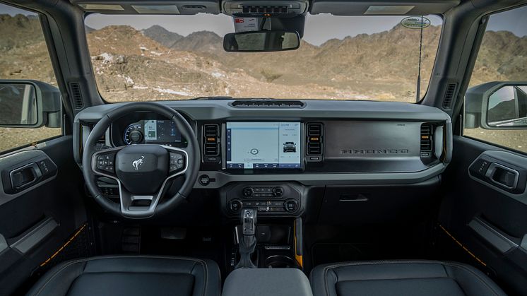 Ford Broncos interiør matcher bilens hårdføre ydre. Instrumentpanelet er inspireret af den første Bronco-generation fra 1966, hvilket blandt andet afspejler sig i valget af naturlige farver. I bilens midterkonsol er der mulighed for trådløs opladning af en telefon, og ved denne feature er der naturligvis taget højde for, at telefonen holdes sikkert på plads selv i situationer i udfordrende terræn, hvor bilen hælder til den ene eller anden side. Instrumentpanelet er desuden designet således, at det nemt kan tørres over med en klud, ligesom alle fysiske stik i bilen er beklædt med silikone for at beskytte mod mudder og snavs.