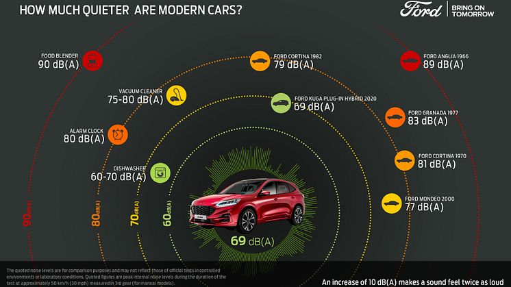Ford Kuga Plug-in Hybrids støjniveau i kabinen er hele 20 dB lavere end støjniveauet i en Ford Anglia fra 1966. De fleste mennesker oplever, at en lyd føles dobbelt så høj, når den springer med 10 dB.