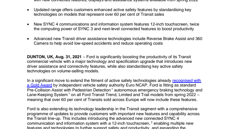 Ford udvider også sit teknologiske forspring i segmentet med de store varebiler med omfattende opdateringer, som giver kunderne væsentligt nyt udstyr og nye muligheder på tværs af hele Transit-modelprogrammet. Det inkluderer introduktionen af det nye online-baserede SYNC 4-infotainmentsystem med 12” touchscreen (standard i Transit Limited). Det giver mulighed for en lang række nye features og teknologier, som hæver sikkerhedsniveauet og produktiviteten - og på den måde udvides den omfattende pakke af førerassistancesystemer med 360 graders kamera og Reverse Brake Assist, som er en nødbremseassistent, der ved bakning opfatter eksempelvis personer bag bilen og automatisk bremser.