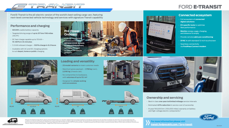 E-Transit, den første fuldelektriske udgave af verdens mest populære varebil, er kulminationen på det vigtige forhold mellem Ford og ejerne og brugerne af den store varebil. Den nye E-Transit er gennemtestet i bl.a. hverdagstest med hjælp fra kunder, og den kommer med klasseledende batteristørrelse, rækkevidde og motorydelse - den fuldelektriske varebil er skabt for at forbedre og lette produktiviteten for varebilskunder- og brugere.