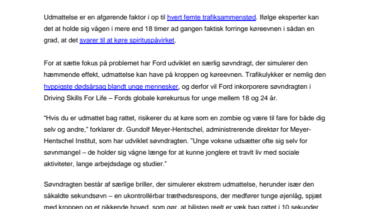 For at sætte fokus på problemet har Ford udviklet en særlig søvndragt, der simulerer den hæmmende effekt, udmattelse kan have på kroppen og køreevnen. Trafikulykker er nemlig den hyppigste dødsårsag blandt unge mennesker, og derfor vil Ford inkorporere søvndragten i Driving Skills For Life – Fords globale kørekursus for unge mellem 18 og 24 år.